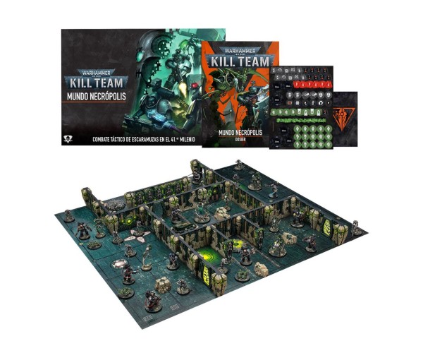 – Expediente Kill Team: Mundo Necrópolis de 80 páginas en tapa blanda: Un compendio de trasfondo, ilustraciones y reglas para los dos comandos incluidos en la caja, además de un resumen con imágenes del planeta Somneft y el complejo sepulcral necrón. También incluye dos nuevos packs de misiones, uno para juego en solitario y cooperativo, y otro para incluir agentes no jugadores Necrones con los que deberán lidiar ambos comandos.